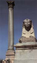 seafront, where there is a statue of the nationalist leader. This was formerly the site of the Caesaruem, a magnificent temple began by Cleopatra for her lover Antony and subsequently completed by their enemy Octavian and dedicated to himself. Two famous obelisks( one known as “Cleopatra’s Needle”, now on the Embakment in London, the other is in New York’s Central Park) were once here but all traces of the temple have disappeared. The days post-colonial architecture, like the Pseudo-Moorich Hotel Cecil, vies with more modern buildings. The older “European” city center was inland of the Monument to the Unknown Soldier, near where the French Gardens used to be, now Midan Tahrir. Strolling round here you can still see old street nameplates and find the jewellry and antiques shops for which the area was known. | ![]() Pompey's Pillar |