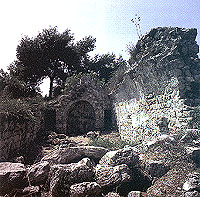 Paintings In an olive grove at the northern edge of Barghoun village lie the remains of a 12th-14th century church dedicated to Saint Barbara. The well preserved apse is decorated with a unique wall painting representing the Virgin as Orans, (hands raised in a traditional gesture of prayer) between two angels. Upon her chest is a shield with the bust portrait of the Christ-Emmanuel. On his right is the motif of the Burning Bush, an image related to the monastery of Saint Catherine in Sinai. |