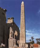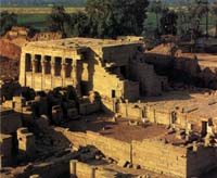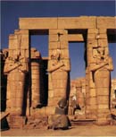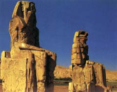 funerary temple. Deir El Bahari, an architectural tour-de-force built against the sheer Theban cliff range. The Colossi of Memnon (misnamed) and actually of Amenophis III. Medinet Habu, Ramses III's funerary temple, anticipating in its style, the mediaeval fortress. |